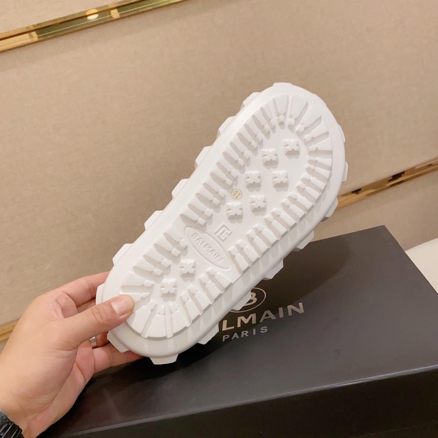 embossed-logo detail slides from Balmain featuring cloud white, slip-on style, embossed logo to the front, open toe, branded insole and flat rubber sole.