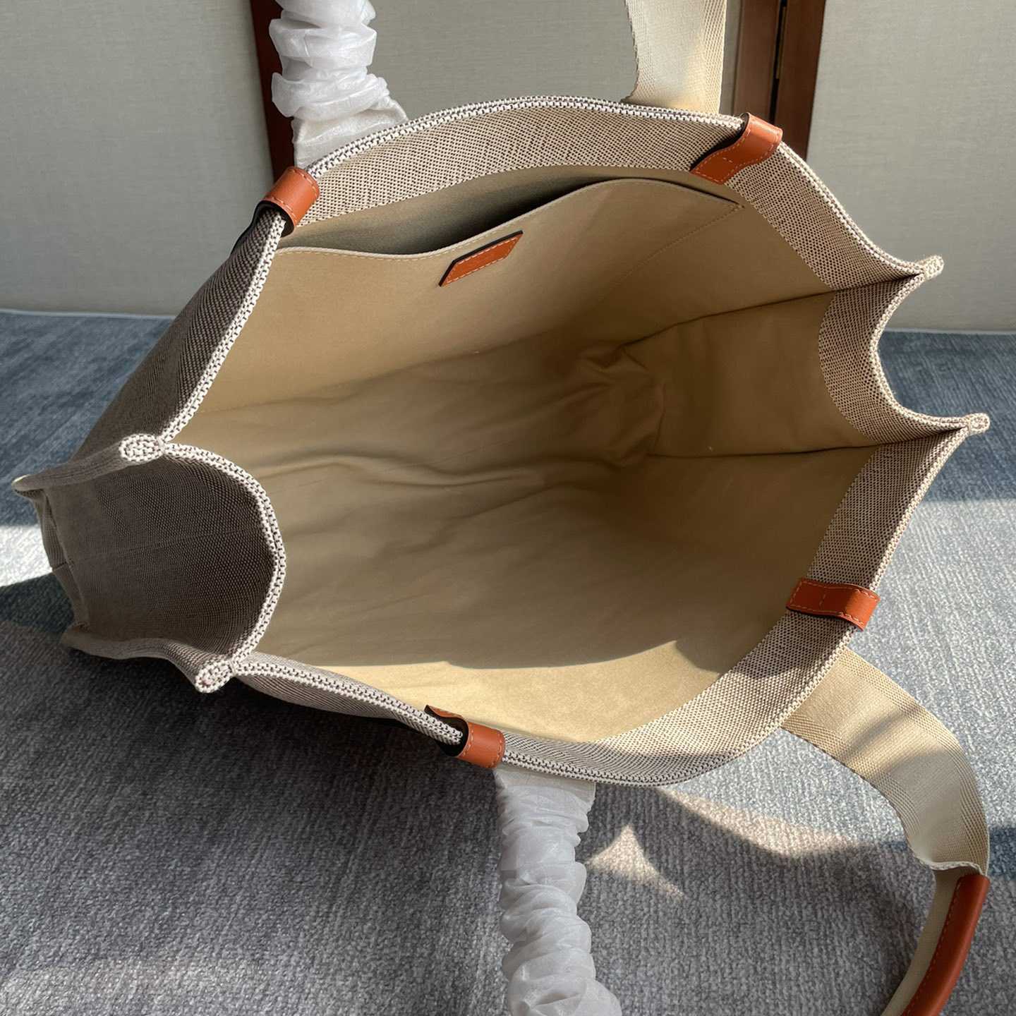 Crafted from lower-impact linen canvas detailed with shiny calfskin strips, this large Woody tote bag is a spacious bag with a strong summer attitude. The roomy inside compartment includes a practical flat pocket.