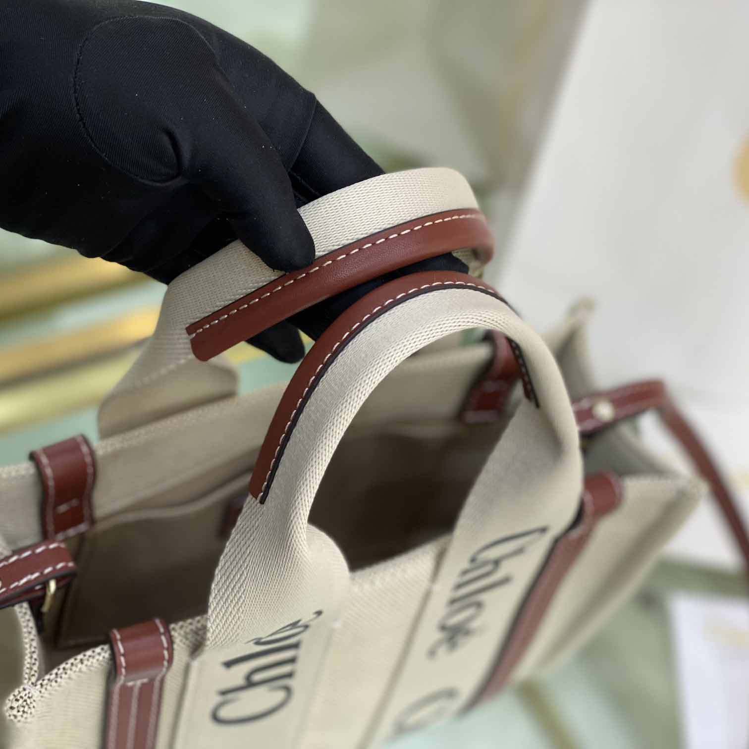 Crafted from subtly speckled cotton canvas detailed with shiny calfskin strips, this small Woody tote bag is a compact day-to-evening bag with a strong summer attitude. The roomy inside compartment includes a practical flat pocket.