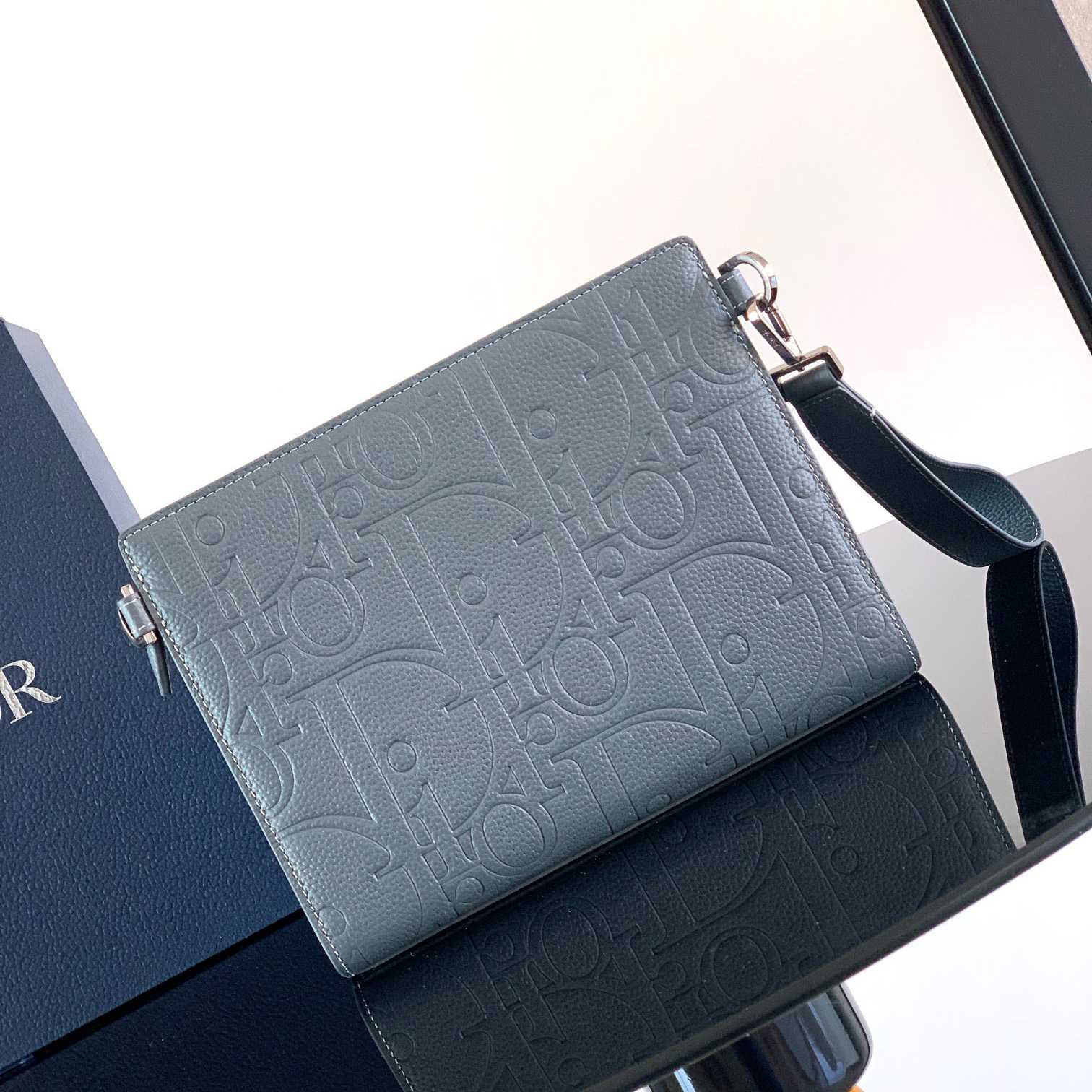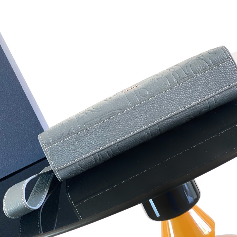 showcases the iconic motif delicately embossed on deep gray calfskin and enhanced by a Dior signature