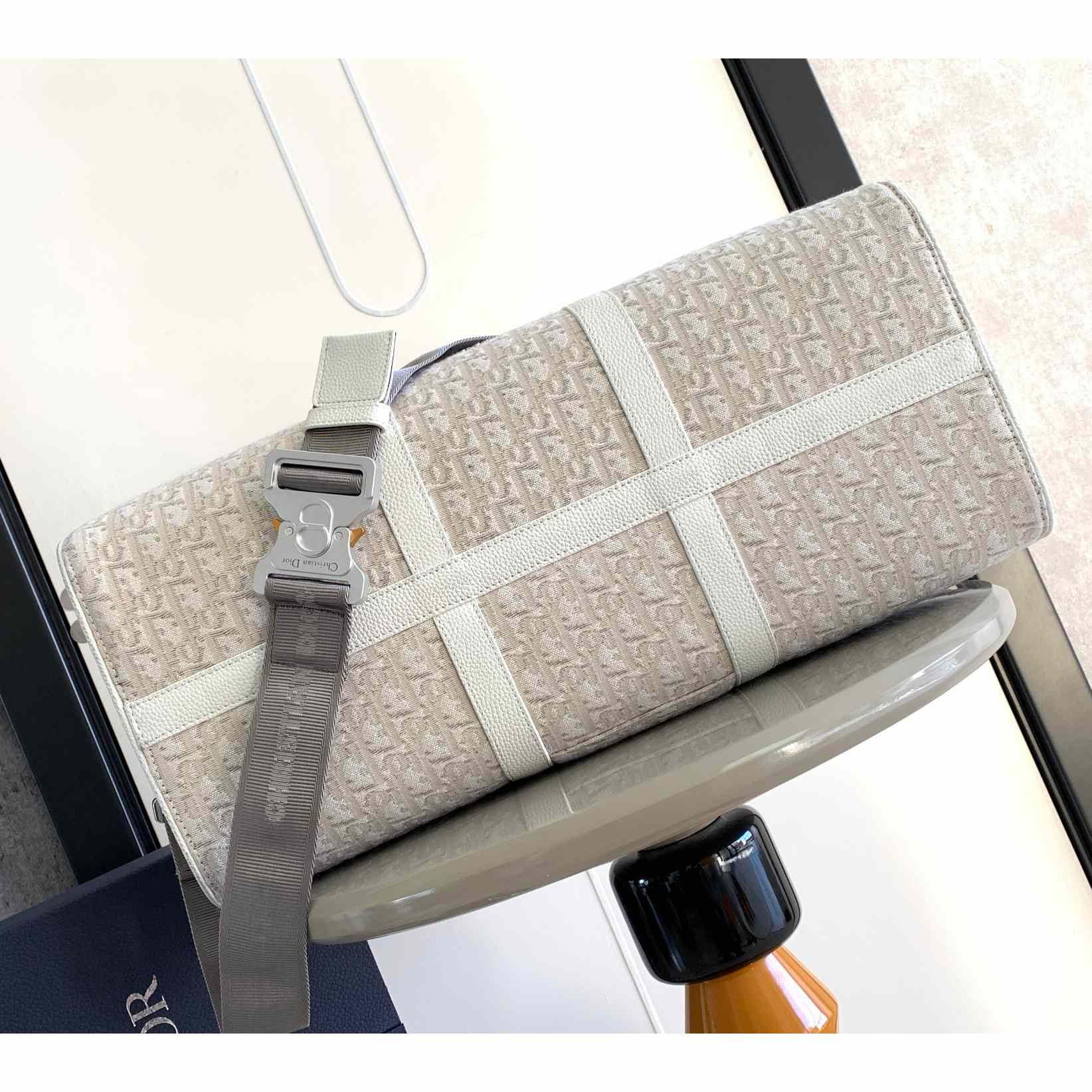 The Dior Lingot 50 Duffle bag is distinguished by a functional and elegant design. The cream Dior Oblique jacquard is enhanced by tonal grained calfskin details and the Dior signature on the front. A zipped compartment with a Saddle flap will hold all the daily essentials. The folding top handles and adjustable, removable shoulder strap with an aluminum buckle allow the bag to be carried by hand, worn over the shoulder or crossbody.