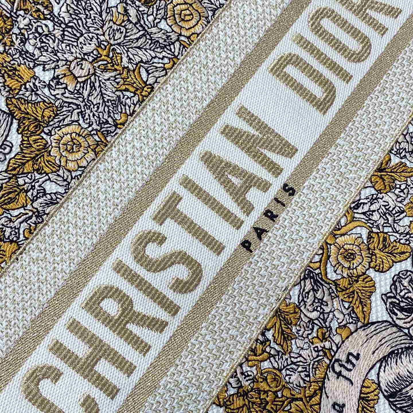 Introduced by Maria Grazia Chiuri, Creative Director of Christian Dior, the Dior Book Tote has become a staple of the Dior aesthetic. Designed to hold all the daily essentials, the latte style is fully embroidered with Pietro Ruffo's gold-tone Dior Around the World motif, showcasing a star decorated with flowers in honor of Scottish heritage, the collection's hallmark theme, and an allegory of the senses with a Marie Stuart quote: En ma fin est mon commencement (In my end is my beginning). Adorned with the Christian Dior Paris signature on the front, the medium tote is a prime example of Dior's savoir-faire and can be carried by hand or worn over the shoulder. The bag can be coordinated with the season's other Dior Around the World creations.