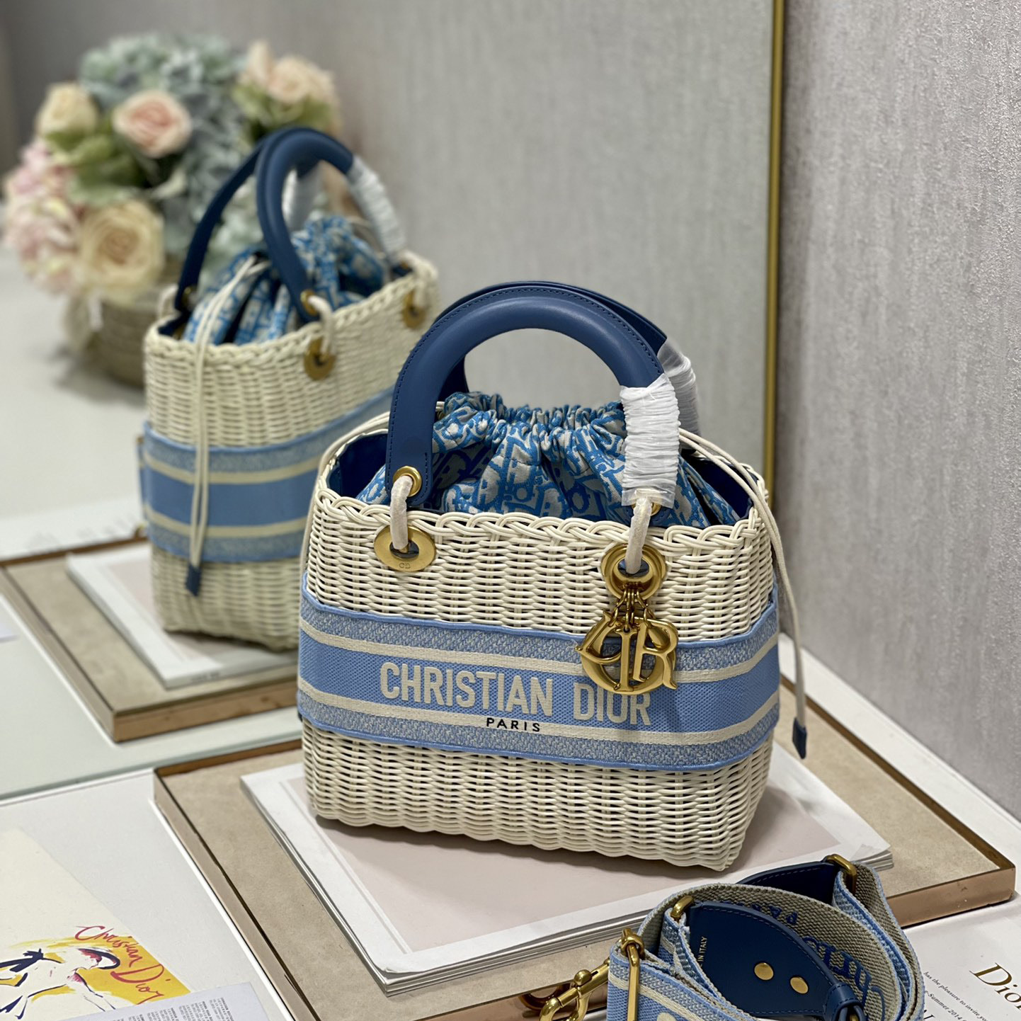 The Lady Dior handbag epitomizes Dior's vision of elegance and beauty. The timeless creation is traditionally crafted in natural hand-woven wicker and exemplifies Dior's savoir-faire. The bag features a blue Dior Oblique jacquard interior pouch with a drawstring as well as a 'CHRISTIAN DIOR PARIS' embroidered band on the front. Antique gold-finish metal 'D.I.O.R.' charms offer an elegant allure. The medium Lady Dior bag, with its wide, removable leather shoulder strap, can be carried by hand or worn crossbody.