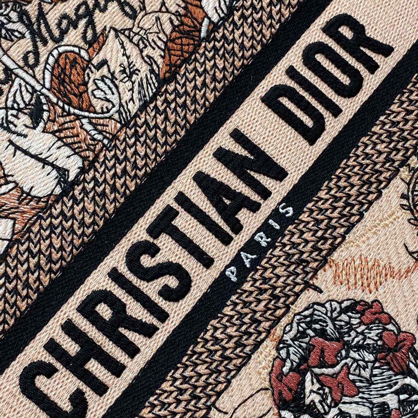 Introduced by Maria Grazia Chiuri, Dior's Creative Director, the Dior Book Tote has become a staple of the Dior aesthetic. Designed to hold all the daily essentials, the style is fully embroidered with the powder pink Dior Jardin Magique motif, a bucolic and enchanting creation inspired by a magical world. The design is adorned with the 'CHRISTIAN DIOR PARIS' signature on the front and exemplifies the House's signature savoir-faire. The medium tote may be carried by hand or worn over the shoulder.