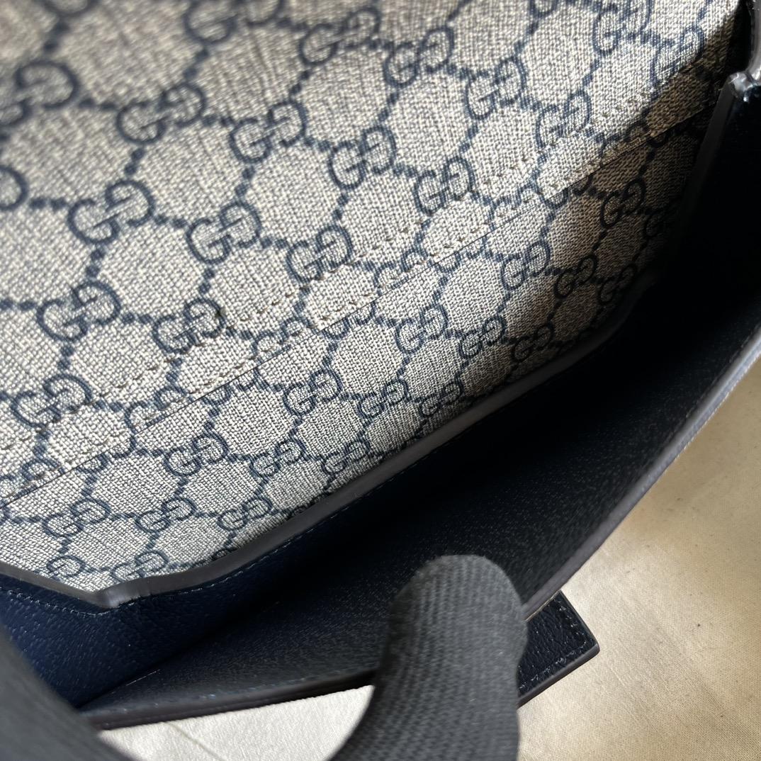 The Blondie hardware, a geometrically shaped version of the Interlocking G logo, continues as part of the latest Gucci collection. The palladium-toned buckle adds a refined vintage feel to this new belt bag style in a beige and blue GG Supreme, while the zip compartment reflects a modern versatility.