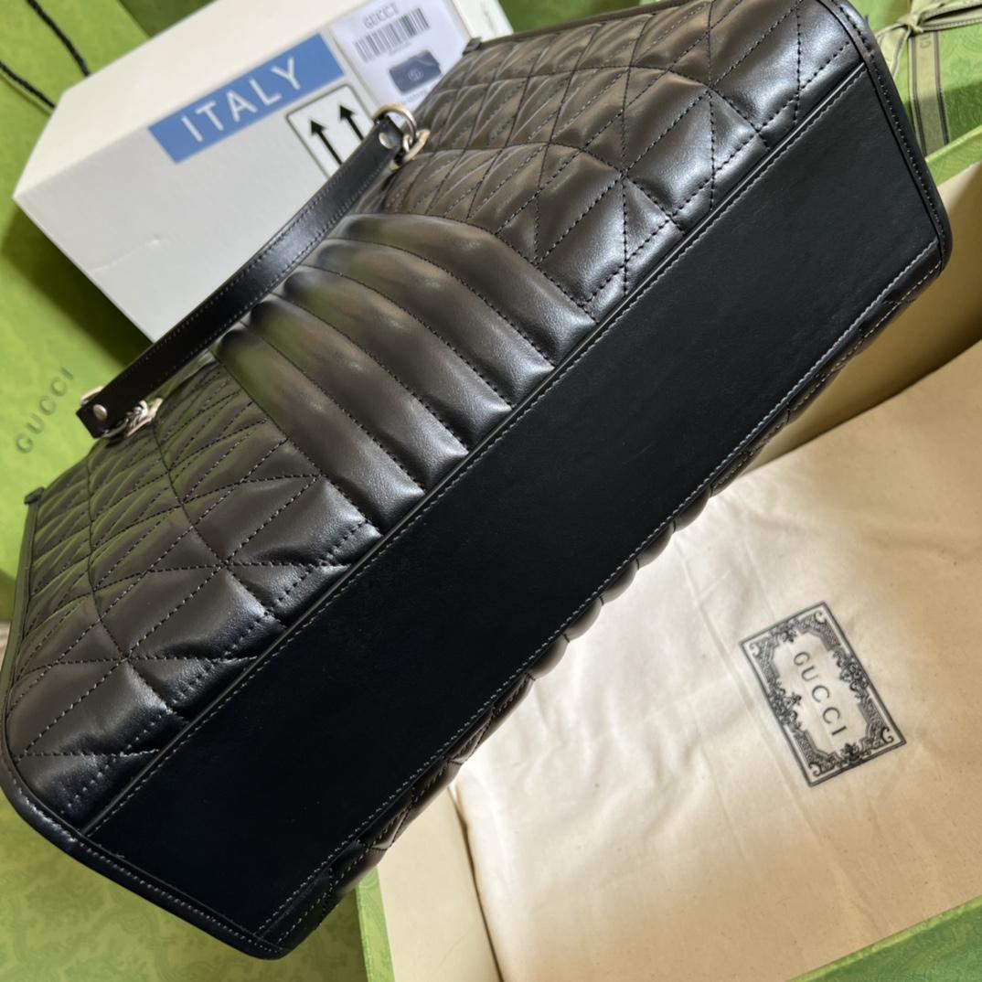 Gucci Aria explores the House's archives, telling Gucci's story though a mix of archival and contemporary elements. The GG Marmont was introduced in one of the Creative Director's first fashion shows and each season its design evolves through the lens of the latest collection. Here, the tote bag is presented in black matelassé leather with antique silver-toned hardware.