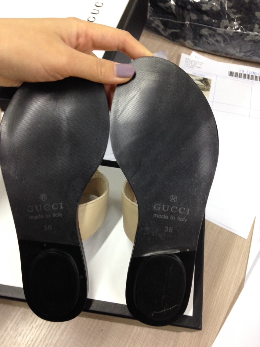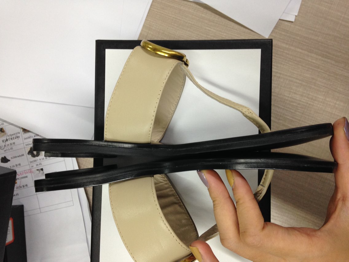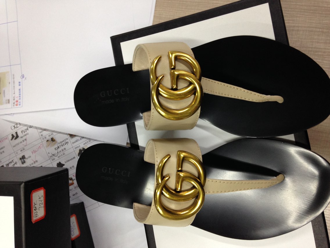 An emblem of the GG Marmont line, the Double G is an archival play on the original Running G, a belt buckle that first appeared in Gucci collections in the '70s. For Pre-Fall 2018, the antique gold-toned detail defines a pair of flat white leather thongs.