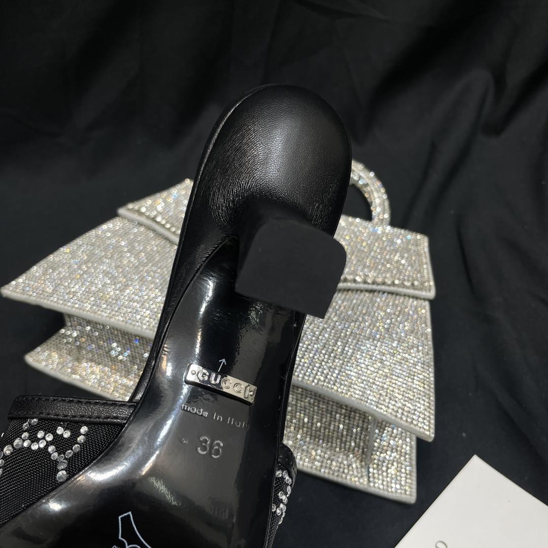 The House's designs continue to play with expectations, bringing together diverse shapes and silhouettes to create hybrid pieces. Crafted from black mesh, an elegant GG crystal motif adds a contemporary feel to this pair of slide sandals.