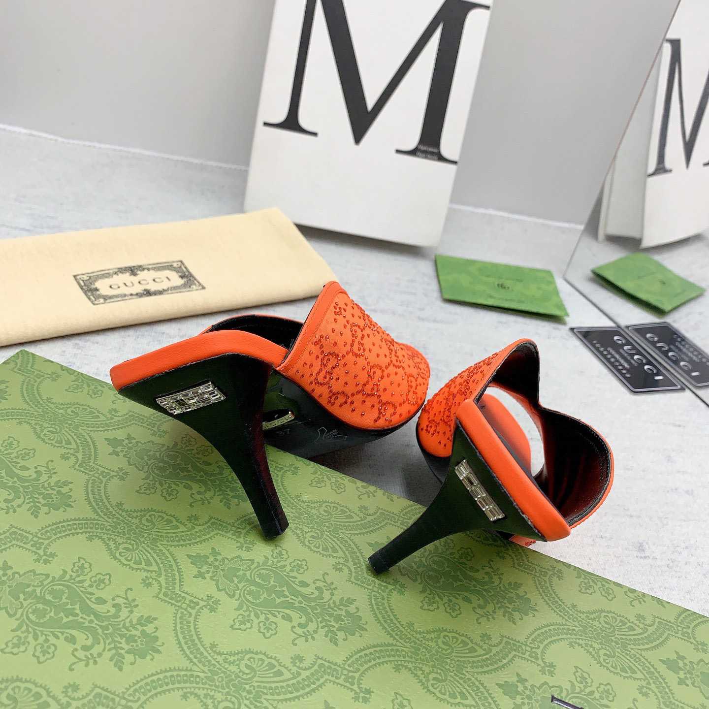 Details designed to illuminate define the collection. A historical location that Alessandro Michele holds dear, Cruise 2023 Gucci Cosmogonie took place against the symbolic setting of Castel del Monte. The use of light throughout the show subtly recalled the monument's picturesque location, 540 meters above sea level, where it is bathed in Italian sunlight at every hour of the day. Crafted with an allover GG motif, this pair of sandals pays ode to the fashion show through sparkling crystals.