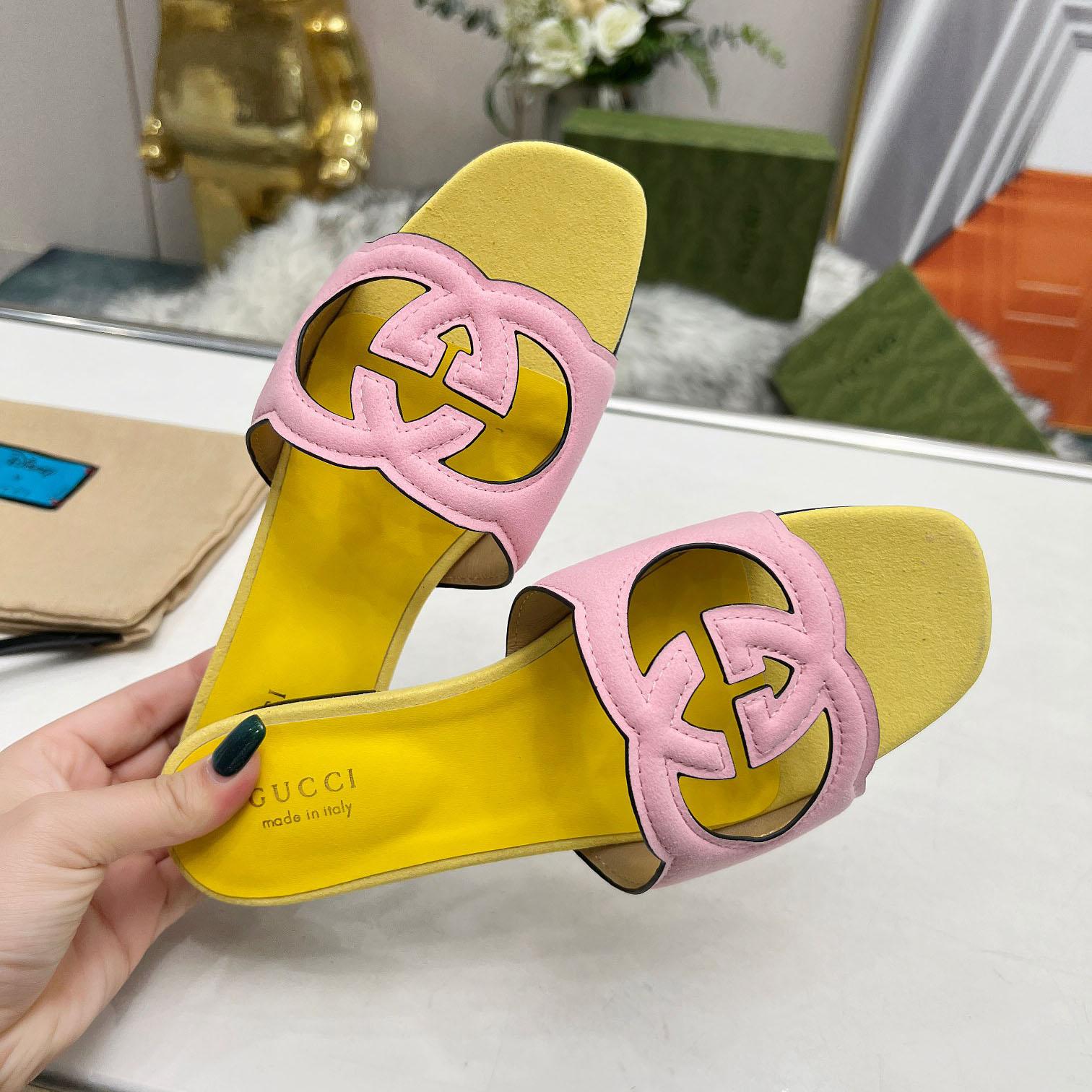 Inspired by the summer spirit and beach clubs on the Italian coast, this item is part of Gucci Lido. Historic symbols continue to be reimagined and reinterpreted in new ways for the latest collections. Influenced by an archival design from the 1970s, the Interlocking G appears as a cut-out detail atop this light pink and yellow suede sandal.
