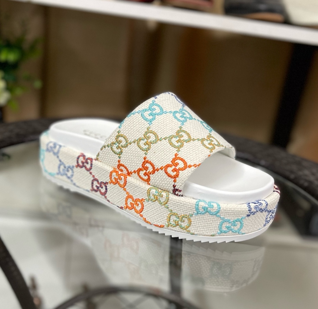 A defined platform sole adds a '90s twist to the slide sandal. Crafted from an oraganic denim jacquard, the allover GG motif references the decade's logo trend, deepening the retro feel.