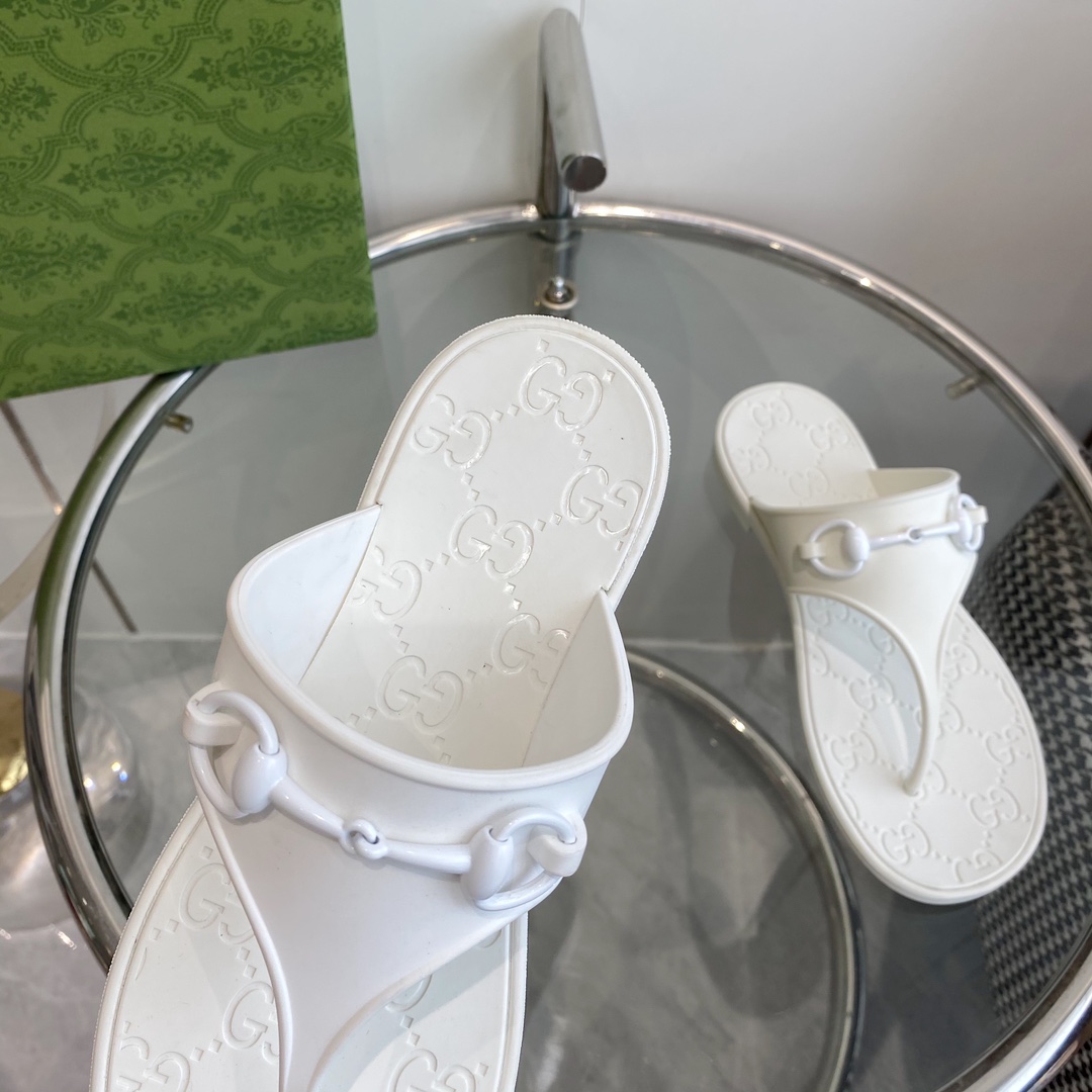 Emblematic codes of the House and refined patterns are reinterpreted in contemporary ways for the Pre-Fall collection. This thong sandal appears in white rubber with the Horsebit hardware enriching the style as an enameled detail.