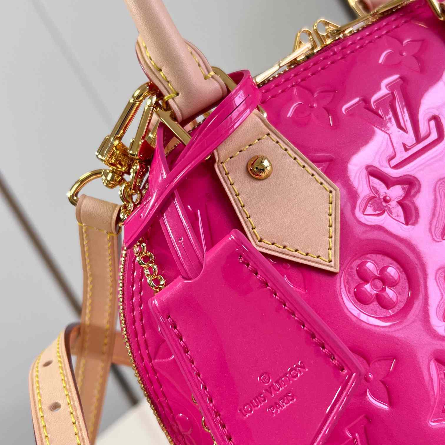 The Alma BB’s distinctive Art Deco shape looks stunning in shiny Monogram Vernis leather, with natural cowhide-leather on the top handle and along the bottom. The pastel colorway and golden rivets on the handle mounts and bottom leather trim bring an on-trend feel. Each bag comes with a matching-colored hair clip.