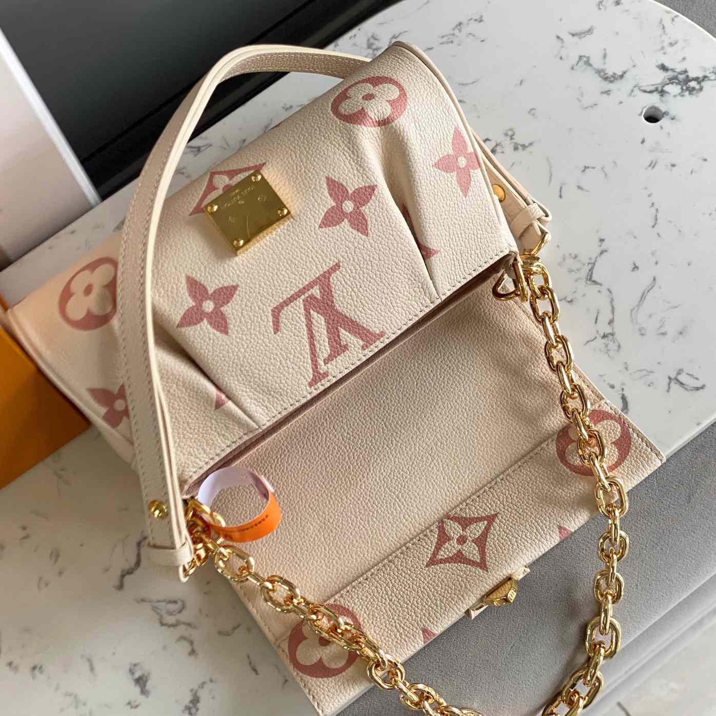The Favorite handbag is fashioned from embossed Monogram Empreinte leather, with a pink Monogram motif printed on a cream-color background. Lined in a greige-toned microfiber, this baguette shoulder bag has a removable and adjustable leather strap for shoulder or cross-body carry as well as a removable golden chain