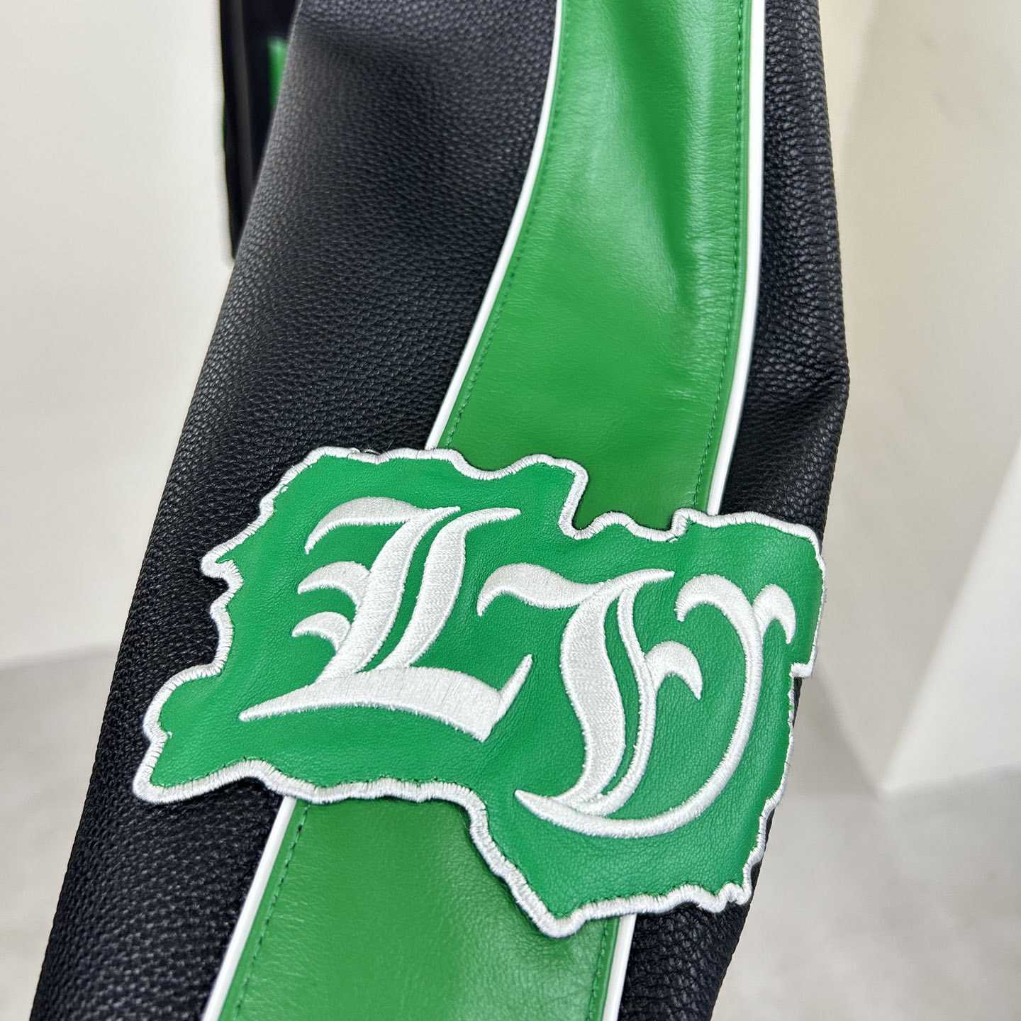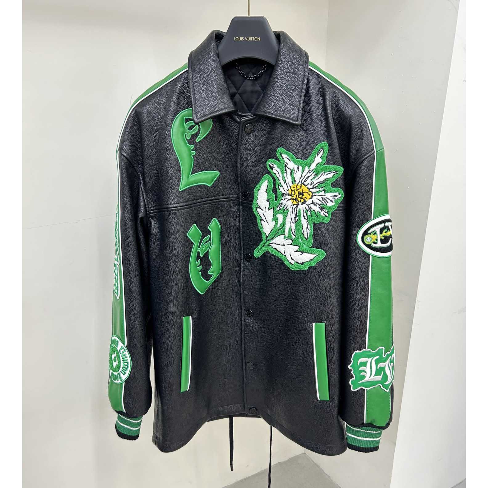 This long calfskin coach jacket with a warm quilted lining is a versatile buy now, wear now piece that protects against the cold. This chic take on an urban piece is embellished with sporty details, including graphic LV signatures and encrusted bold green leather bands on the sleeves.
