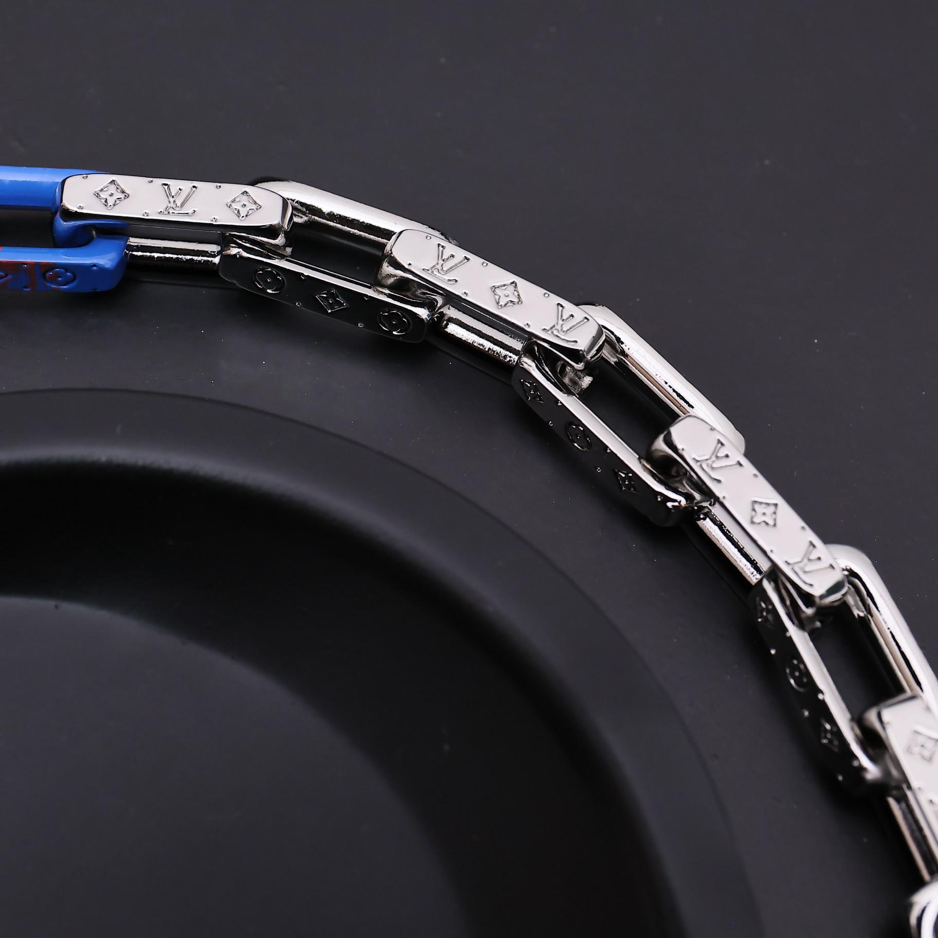 A cool mix of stainless steel, plexiglass and recycled resin gives this Monogram Chain necklace a contemporary attitude. Each metal link features finely engraved Monogram motifs, showcasing the Maison’s expert craftsmanship. An LV Initials charm adds a playful finishing touch to the piece, which can be worn with the matching bracelet for maximum style impact.