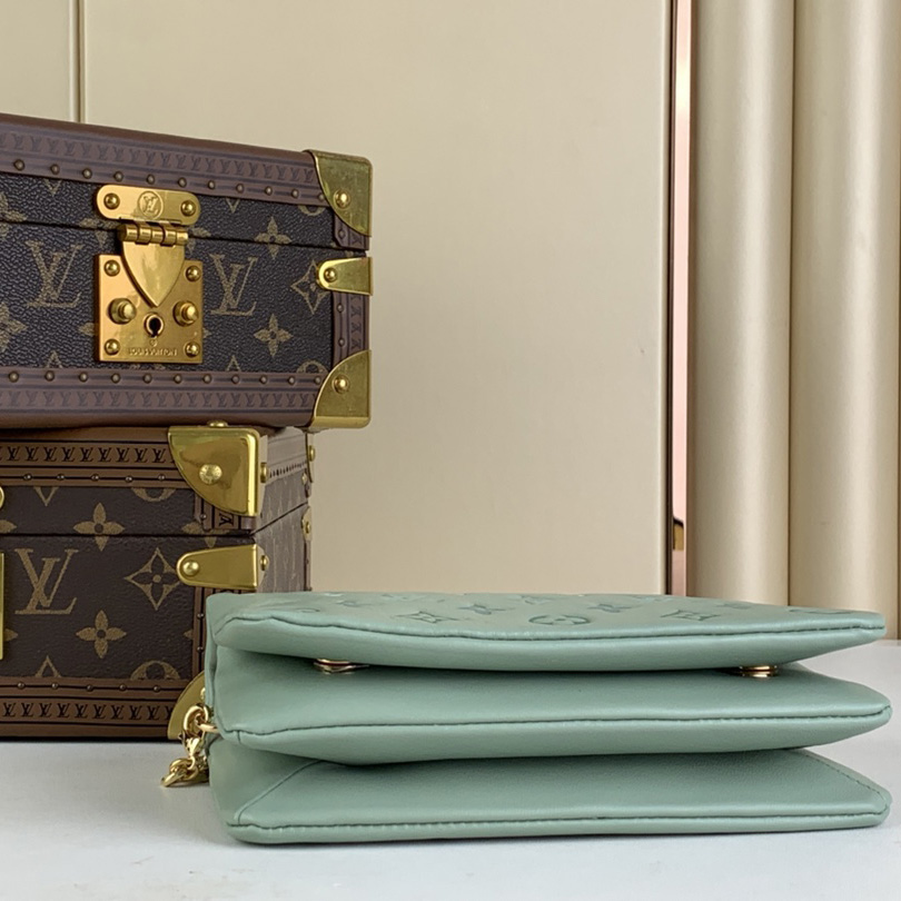 The Pochette Coussin is crafted from soft lambskin, which is embossed with the Monogram pattern to create a puffy, cushiony effect. Notable for its supple, body-friendly shape, this small bag has a removable chain, decorated with an LV Circle charm, which offers different carry options: clutch, shoulder or belt.