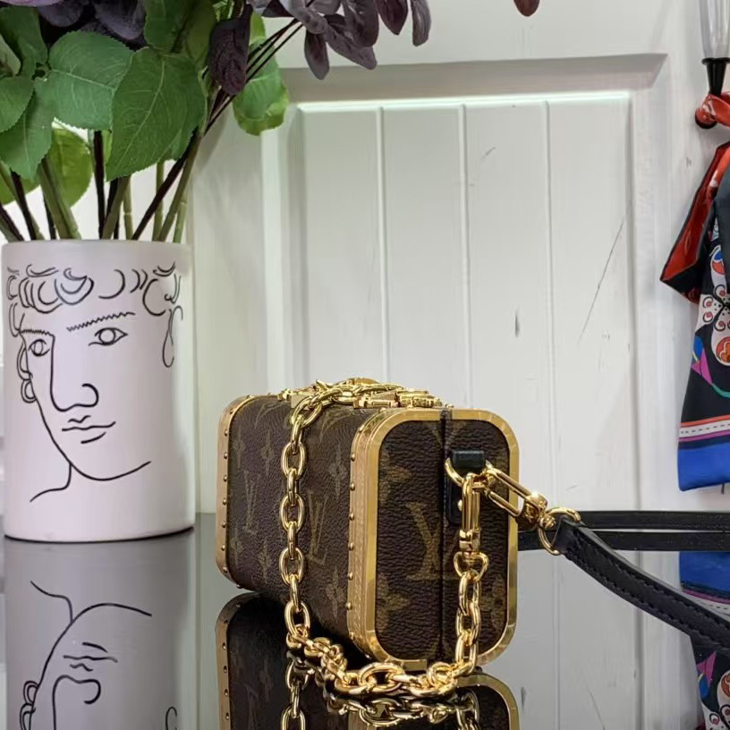 Inspired by the Petite Malle, the Vanity Case is a structured bag with an elongated silhouette, fashioned from Monogram canvas with glossy golden end bands, clasps, and N-lock. It can be carried by hand, short on the shoulder thanks to the removable chain for a 90's look, or worn as a chic cross-body bag with the leather strap.