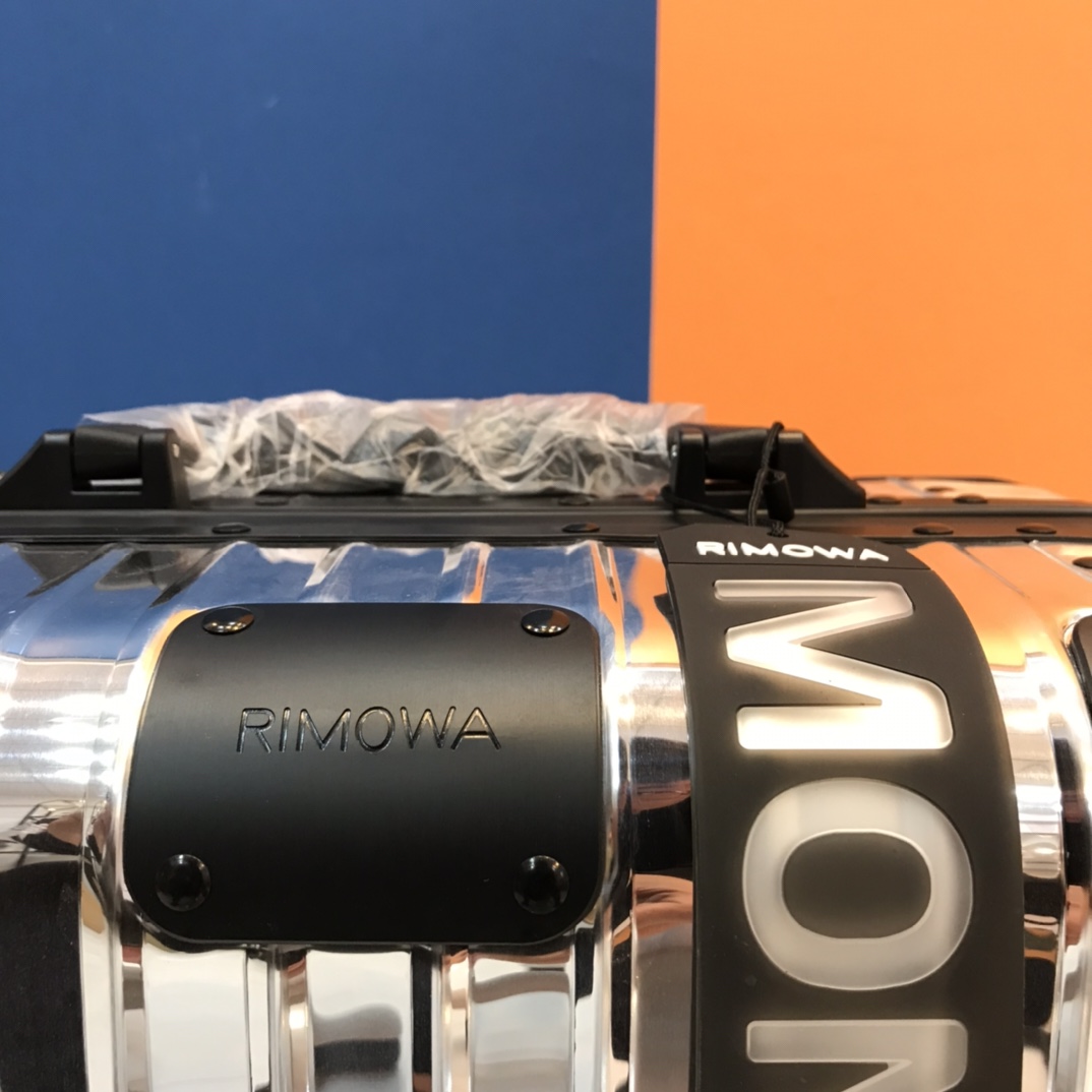 Polished anodized aluminum suitcase in silver-tone. Single-stage telescoping handle. Grab handle at top and side. Four dual wheels. Logo plaques in black at face. Detachable logo-embossed rubberized strap with magnetic hinged pull-release fastening. Detachable logo-embossed rubberized tag.