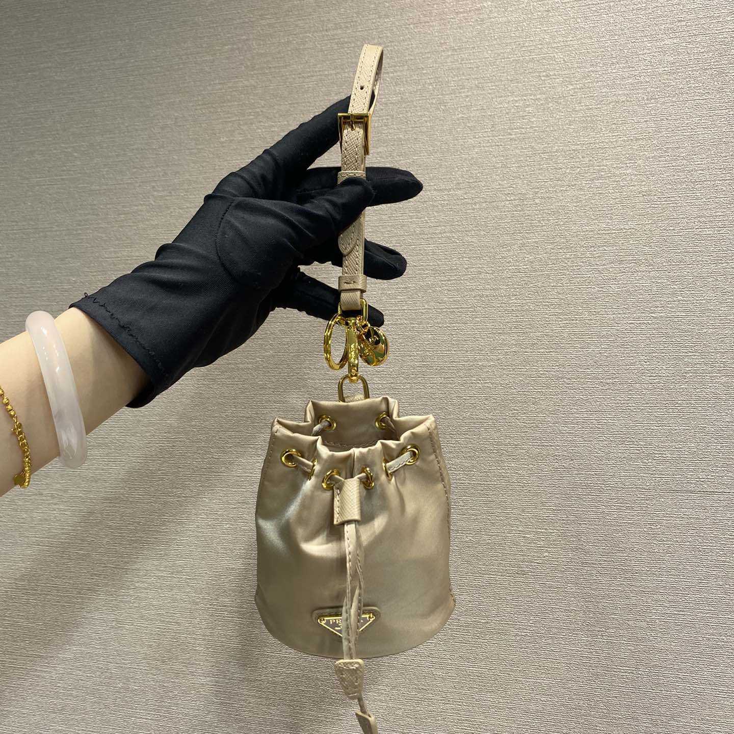 This mini-pouch bag charm, inspired by an archive design, is made of Re-Nylon, the sustainable evolution of a distinctive material of Prada collections. The style combines the functionality of regenerated nylon with refined details like the leather wristlet and gold-tone hardware. The enameled metal triangle logo enhances the accessory with an iconic touch.