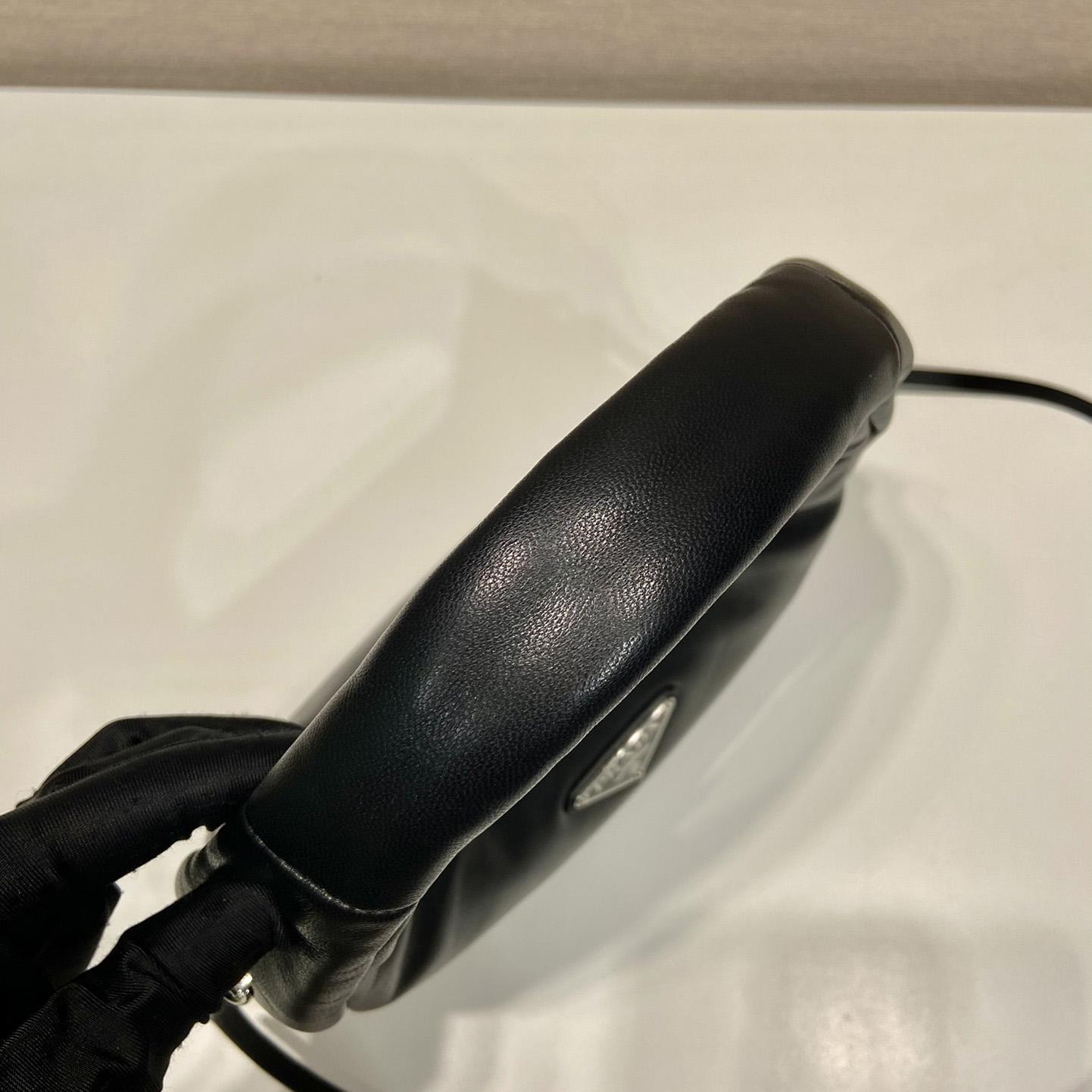 A harmonious, bold silhouette characterizes this mini-bag made of padded nappa leather accented with the detachable, adjustable shoulder strap. Defined by its versatile allure, the accessory has a zipper closure and is decorated with the emblematic enameled metal triangle logo.