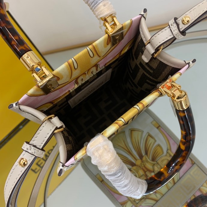Mini Sunshine shopper made of leather with a Versace by Fendi print. Born of the creative collaboration between the two fashion houses, the graphics combine the iconic Fendi FF logo with the Versace Baroque print in pink, gold and white. Laminated leather inlaid FENDI lettering and stiff tortoiseshell-effect plexiglass handles.
